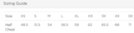 | Half Chest (cm) | 50 | 52 | 54 | 56.5 | 59 | 62 | 65 | 68 | 71 | 73.5 | 76 |
